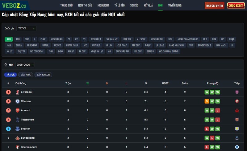 Bảng xếp hạng bóng đá ngoại hạng anh và nhiều giải đấu khác trên VeboTV câp nhật nhanh và chính xác nhất